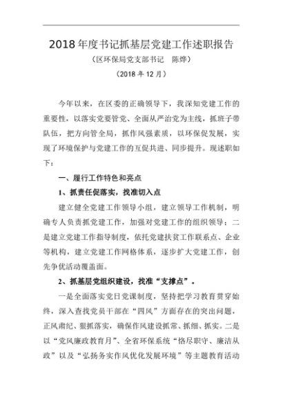 / 述职报告:2018年度书记抓基层党建工作述职报告(环保局)