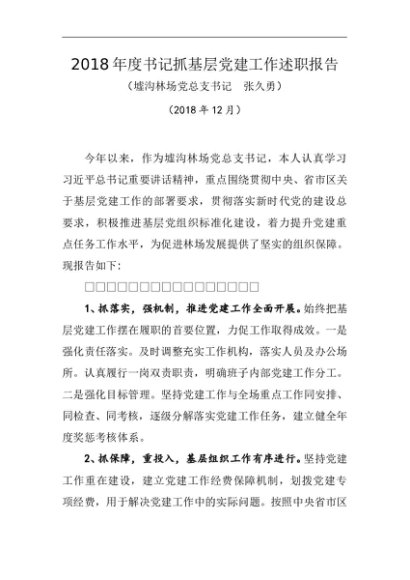 / 述职报告:2018年度书记抓基层党建工作述职报告(墟沟林场)