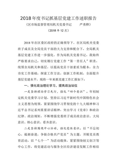 / 述职报告:2018年度书记抓基层党建工作述职报告(市场局)