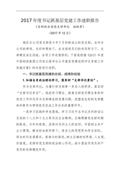 述职报告:2017年书记抓基层党建工作述职报告(邮政分局)