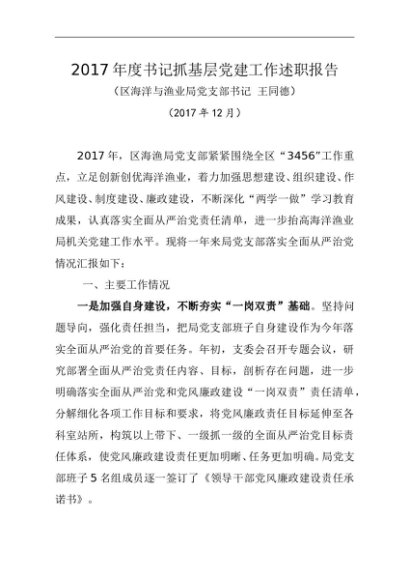 / 述职报告:2017年书记抓基层党建工作述职报告(海渔局)