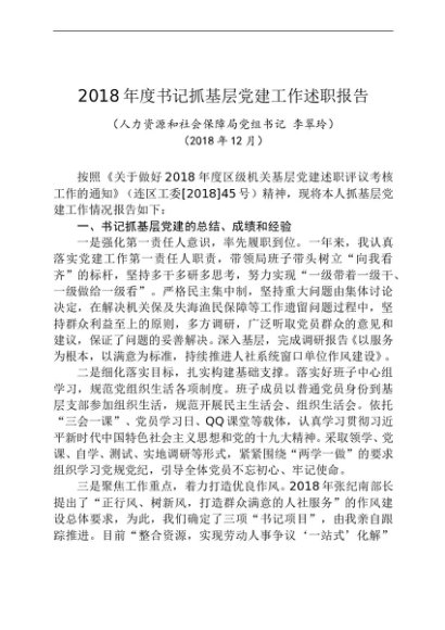 / 述职报告:2018年度书记抓基层党建工作述职报告(人社局)