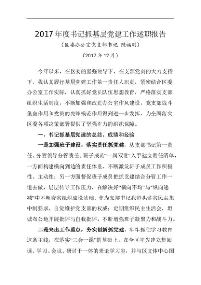 / 述职报告:2017年书记抓基层党建工作述职报告(区委办)