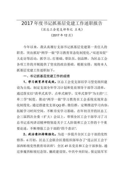 / 述职报告:2017年书记抓基层党建工作述职报告(工会)