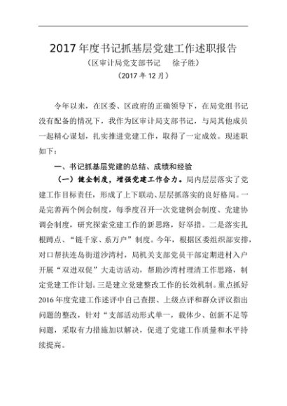 / 述职报告:2017年书记抓基层党建工作述职报告(审计局)