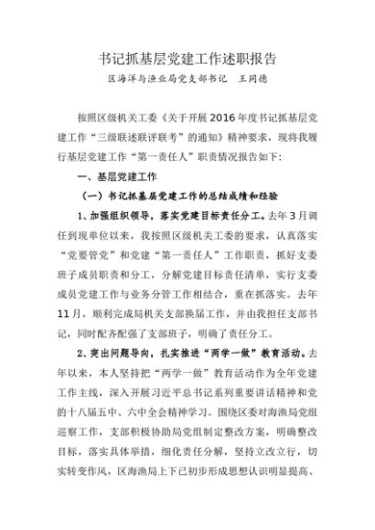/ 述职报告:2016年度书记抓基层党建工作述职报告(海渔局)