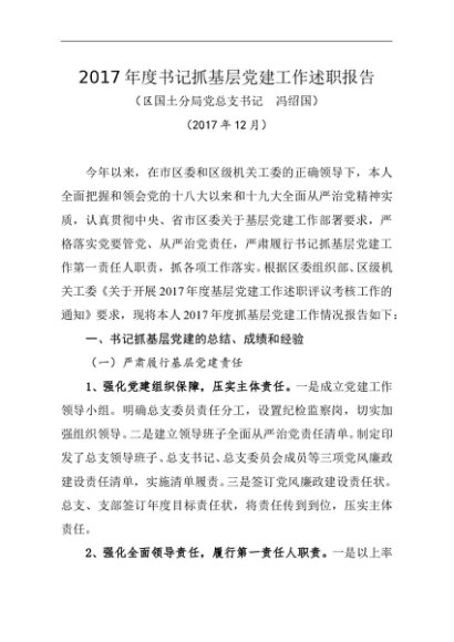 / 述职报告:2017年书记抓基层党建工作述职报告(国土分局)