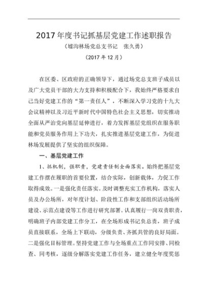 / 述职报告:2017年书记抓基层党建工作述职报告(墟沟林场)