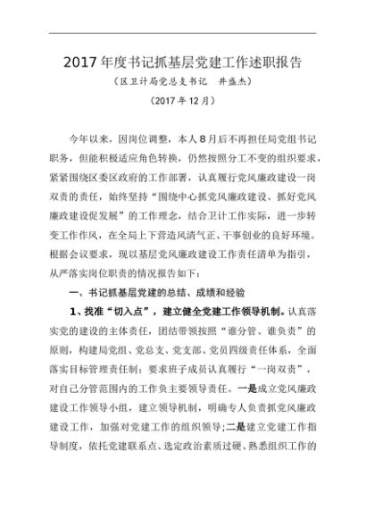 / 述职报告:2017年书记抓基层党建工作述职报告(卫计局)