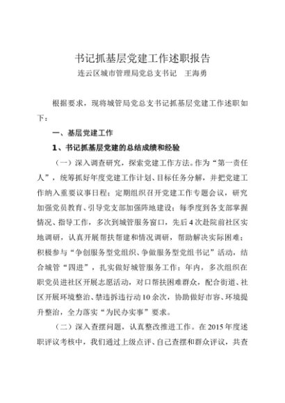 / 述职报告:2016年度书记抓基层党建工作述职报告(城管局)