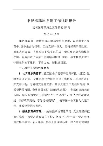 / 述职报告:2015年度书记抓基层党建工作述职报告(环保局)