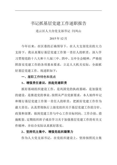 / 述职报告:2015年度书记抓基层党建工作述职报告(人大办)