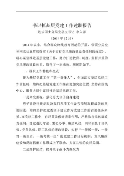 / 述职报告:2014年度书记抓基层党建工作述职报告(国土分局)