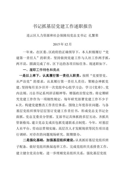 / 述职报告:2015年度书记抓基层党建工作述职报告(人社局)