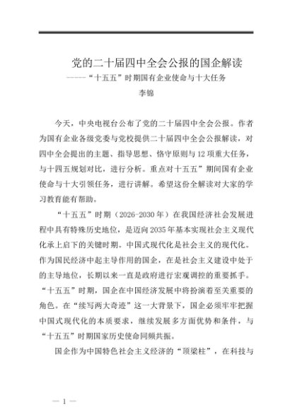 / 专题学习:二十届四中全会│20251023党的二十届四中全会公报的国企解读——“十五五”时期国有企业使命与十大任务