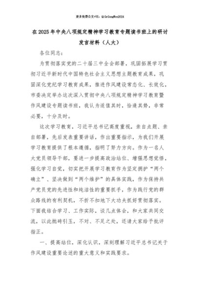 / 2025主题教育│07读书班:在2025年中央八项规定精神学习教育专题读书班上的研讨发言材料(人大)