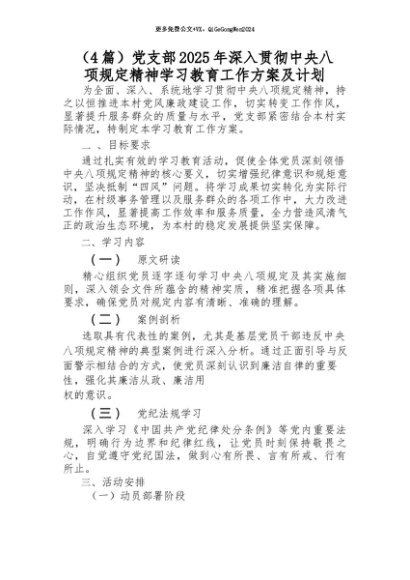 / 2025主题教育│02方案计划:党支部2025年深入贯彻中央八项规定精神学习教育工作方案及计划(4篇)