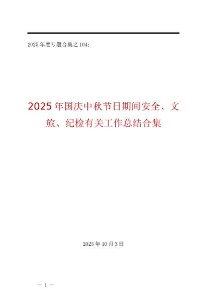 / 2025年度专题合集104:2025年国庆中秋节日期间安全、文旅、纪检有关工作总结合集(10篇)