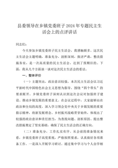 / 组织生活:2024年度“四个带头”民主生活会:6-05县委领导在乡镇党委班子民主生活会上的点评讲话