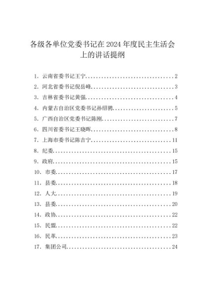 / 组织生活:2024年度“四个带头”民主生活会:3-06各级各部门党委书记在民主生活会上的总结讲话提纲合集(19篇)