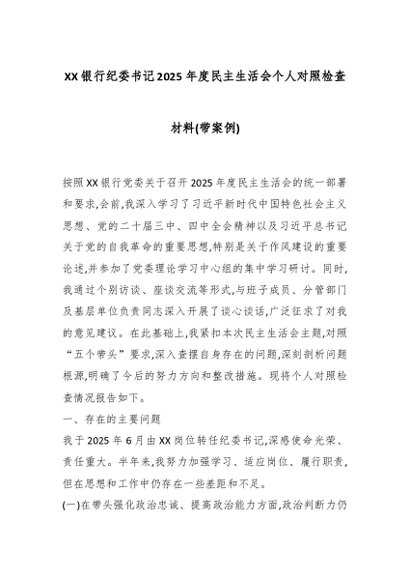 / XX银行纪委书记2025年度民主生活会个人对照检查材料(带案例)