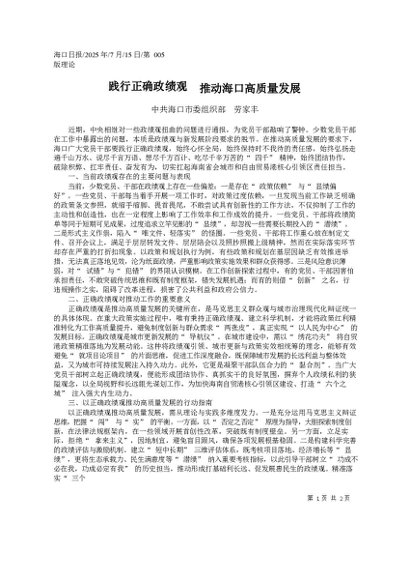 践行正确政绩观__推动海口高质量发展_中共海口市委组织部__劳家丰