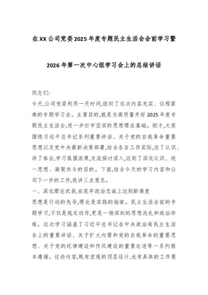 组织生活:2025年度│03会前学习:在XX公司党委2025年度专题民主生活会会前学习暨2026年第一次中心组学习会上的总结讲话
